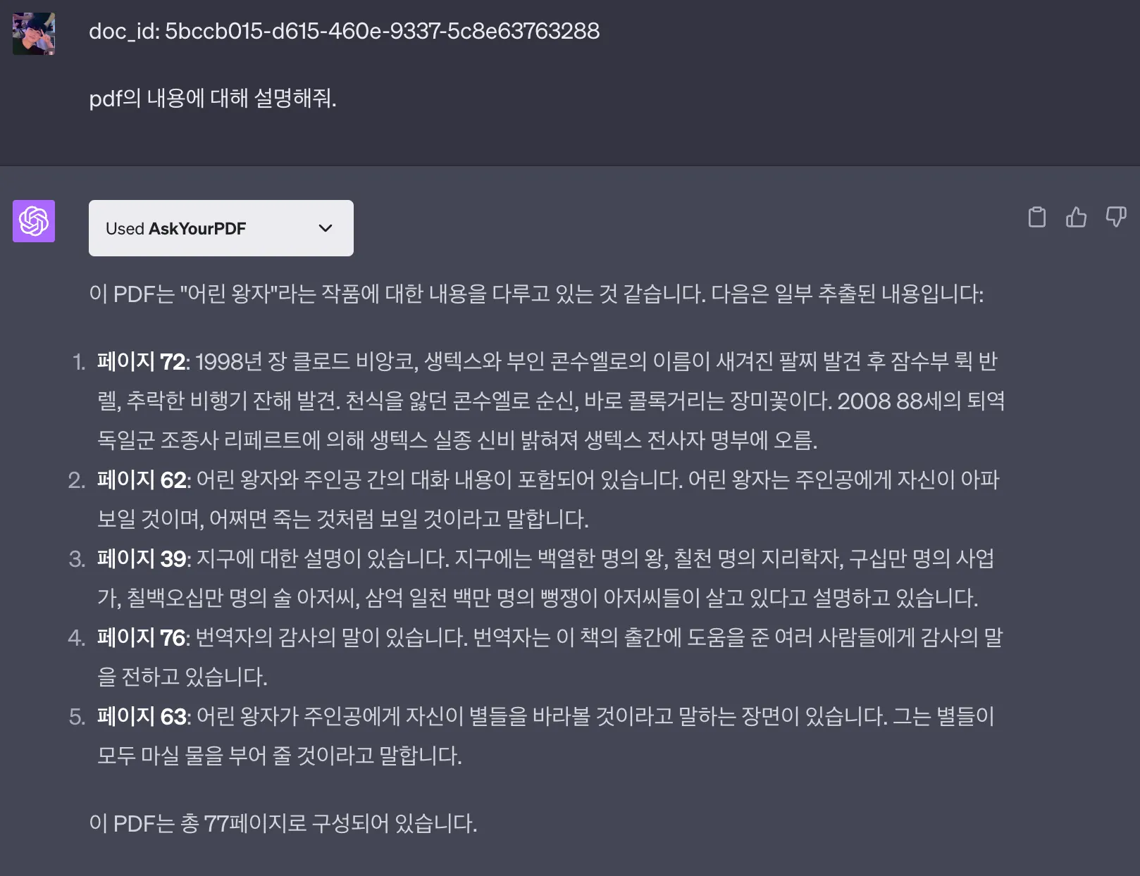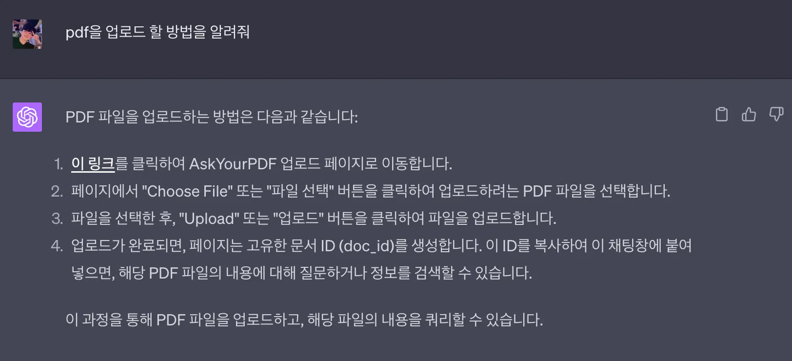 이 PDF id와 함께 질문을 하면, PDF 내용을 기반으로 답변을 해줍니다.