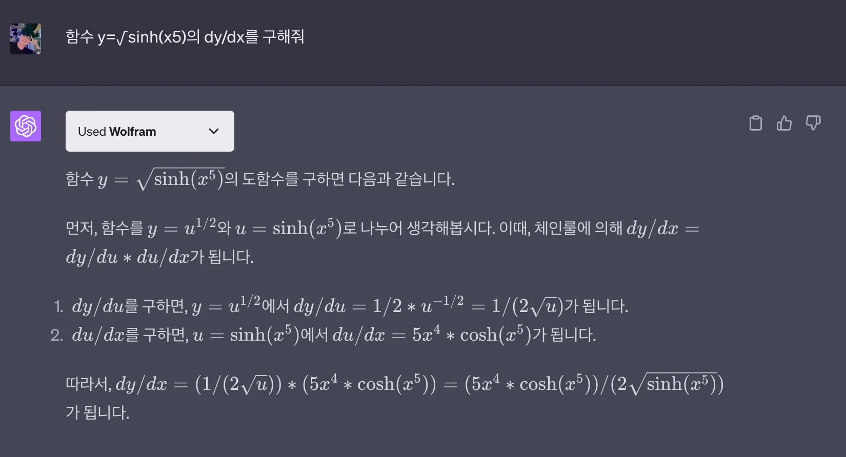 플러그인을 적용해 계산 부분을 울프람에게 맡겨 답변의 품질을 높일 수 있습니다.