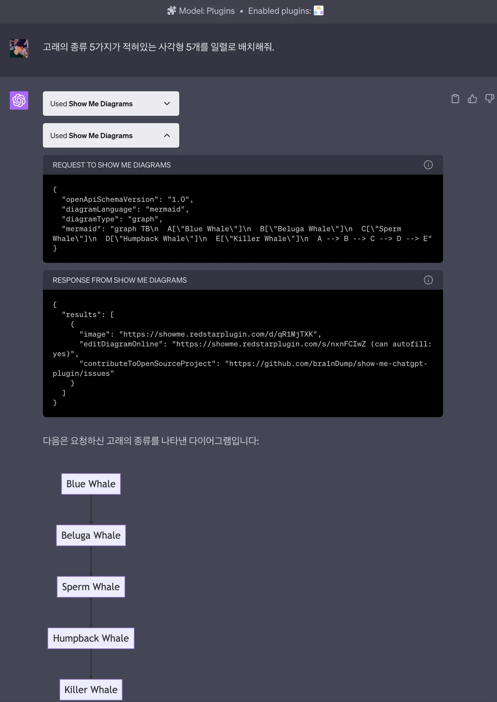GPT가 다이어그램을 그려주는 플러그인에게 적절한 요청을 제작해 전송합니다.