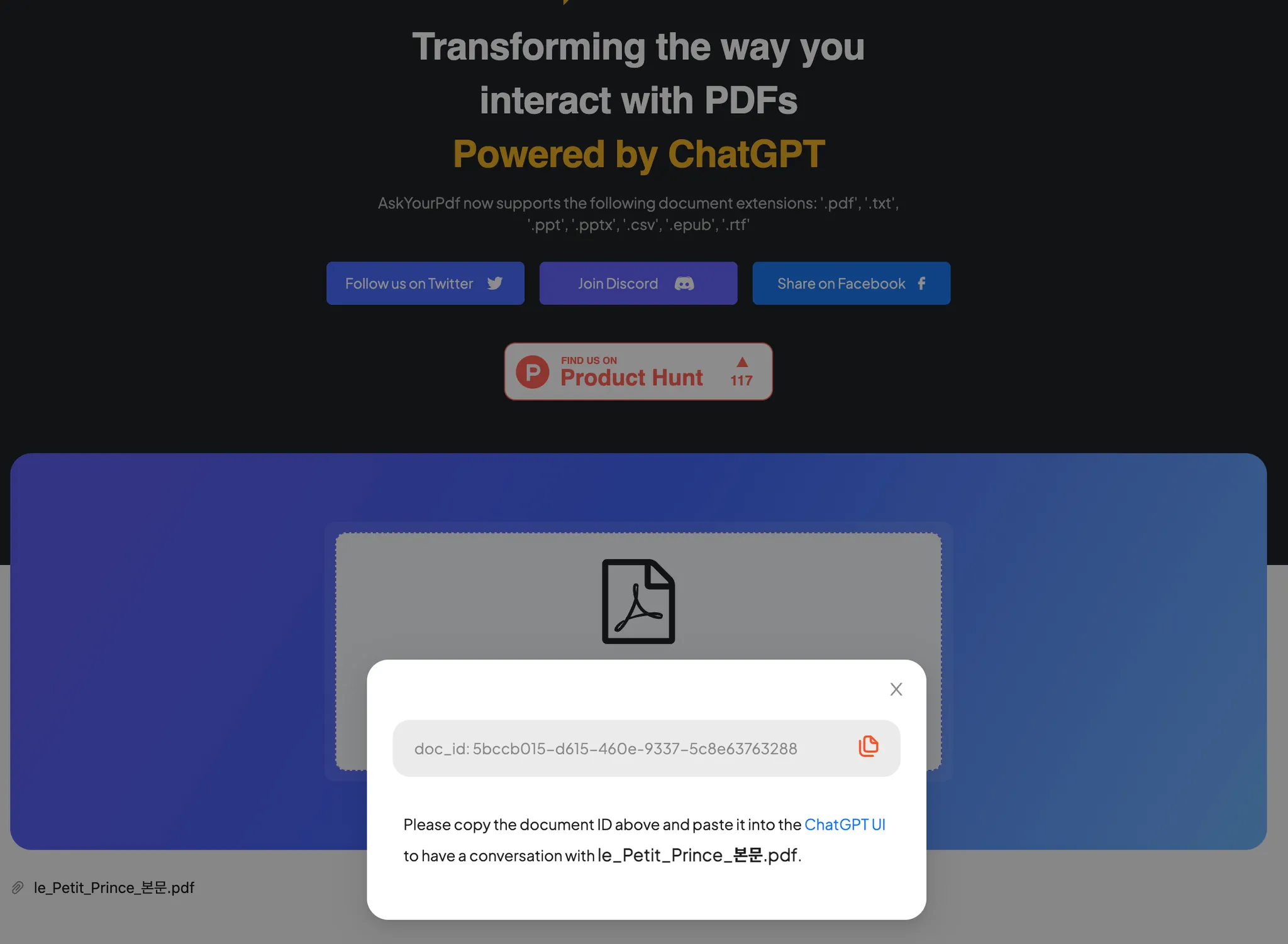 GPT가 답변해준 링크로 들어가 PDF를 업로드하면 업로드한 PDF의 id를 알려줍니다.