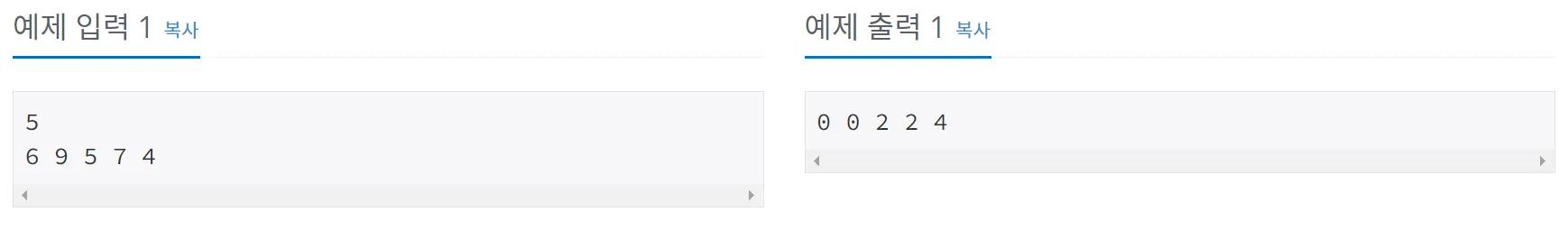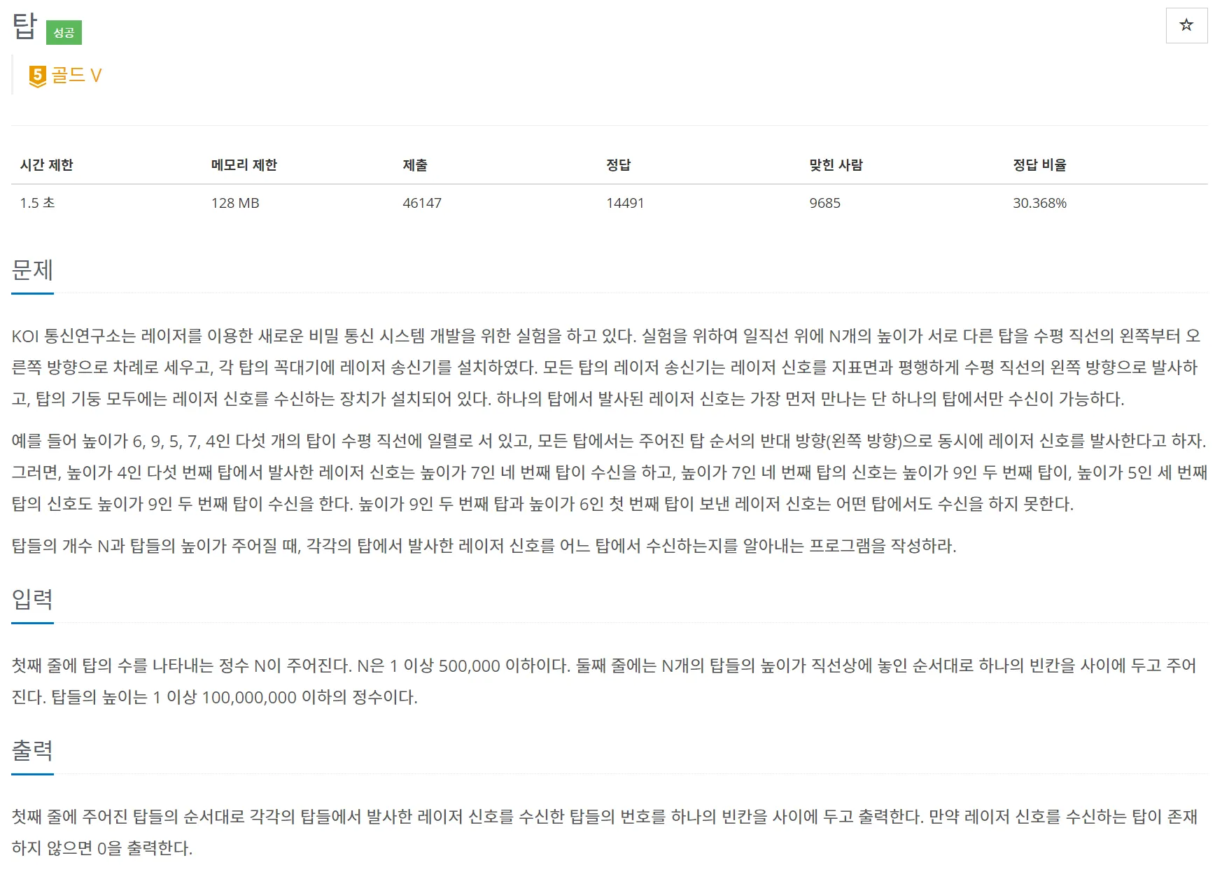 문제를 다시 읽어봤을 때 탑의 높이는 왼쪽에서 순서대로 입력값이 주어지는데, 탑이 발사하는 레이저의 방향이 왼쪽이라는 점에 주목해야 한다. (입력값이 주어지는 방향과 반대)
