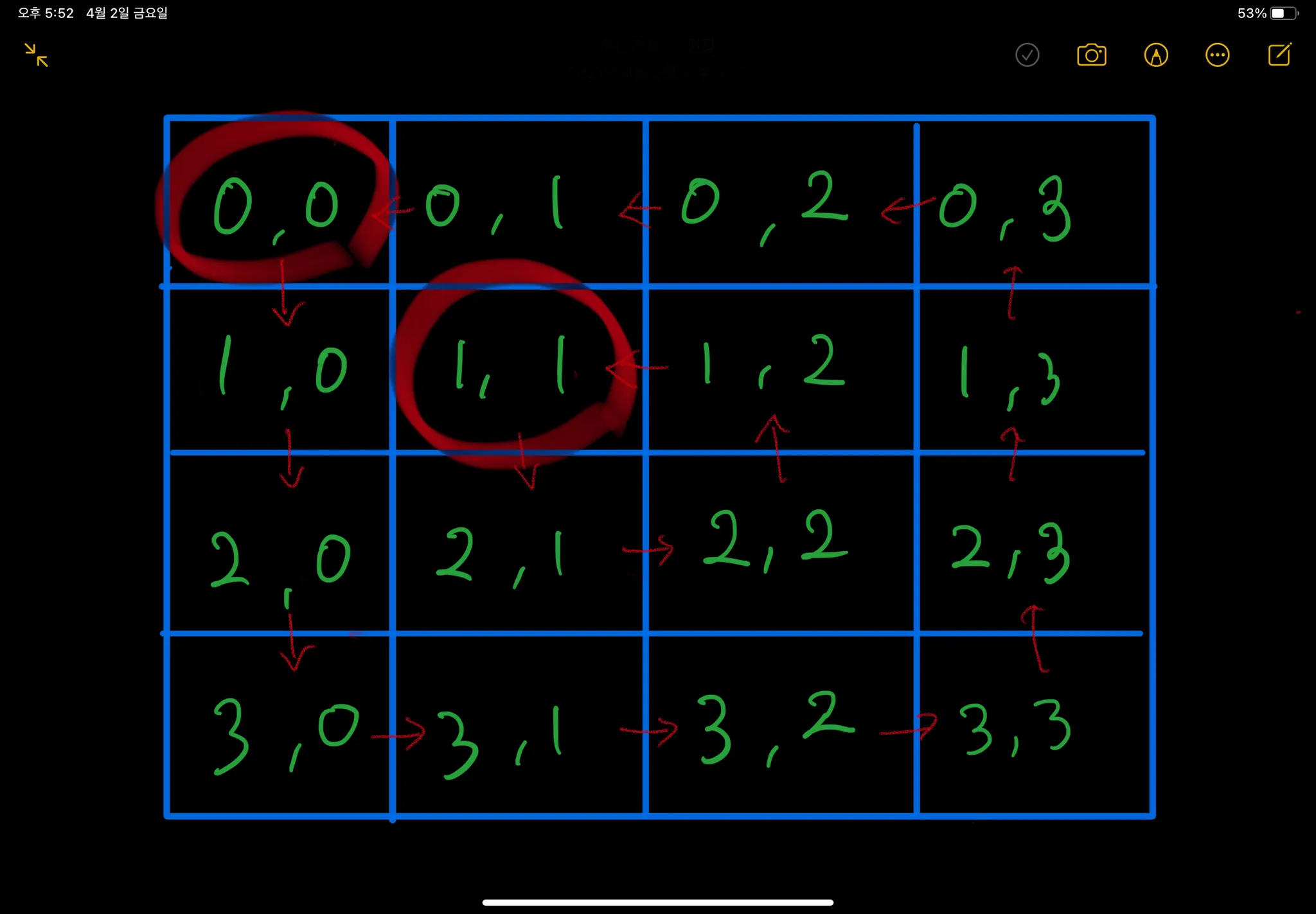 지속해서 바꿔주다 0,0 / 1,1 ... 등을 만나면 다음 사각형을 돌리는 방식으로 구현했다.