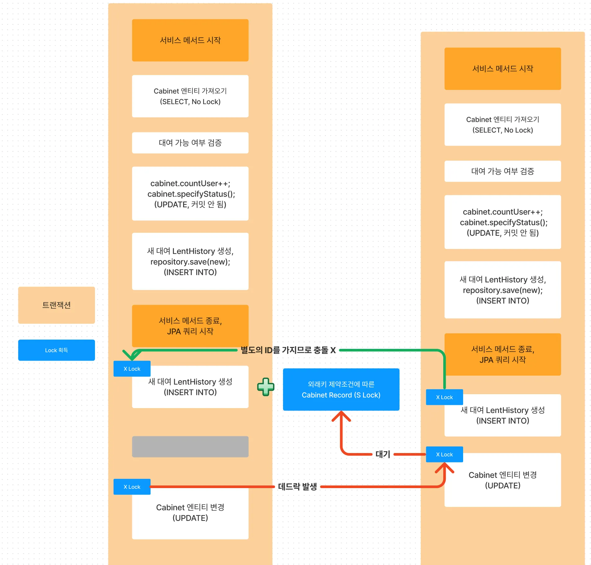 → 그 이유는, lent_history의 row를 insert하고(여기까지 문제없음), 외래 키 제약조건으로 연관되어 있는 cabinet row의 값을 READ(S Lock 획득), UPDATE(X Lock)할 때 상호 대기 상태에 놓여있게 되기 때문이다.