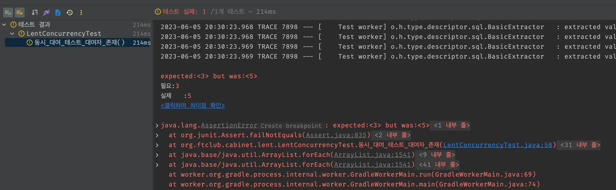 낙관적 락을 수행한 것에 알맞게, 먼저 커밋이 성공한 한명만 대여를 성공하고, 나머지는 실패했다. + 버전 충돌로 인한 ObjectOptimisticLockingFailureException이 발생한 것을 볼 수 있다.