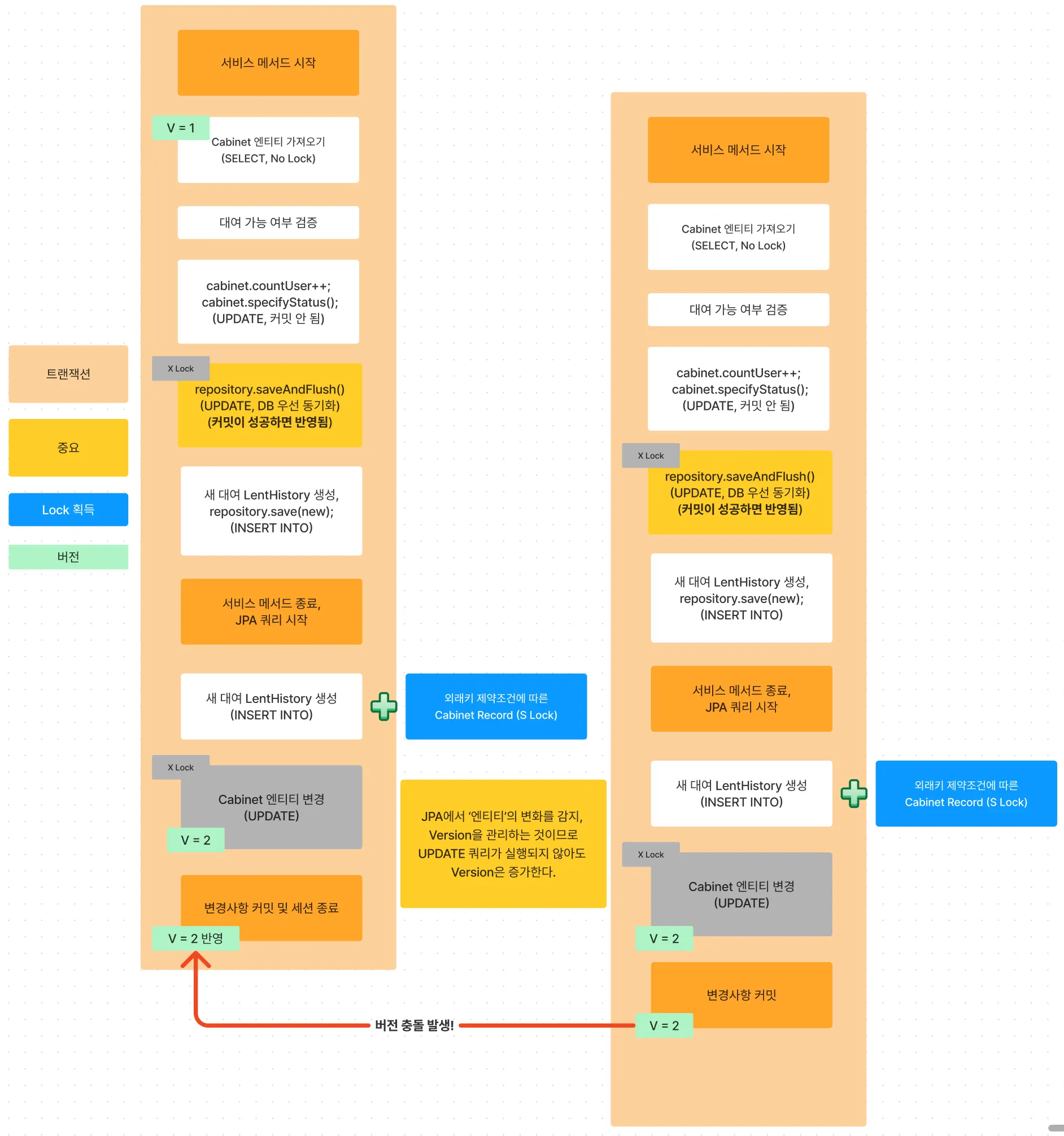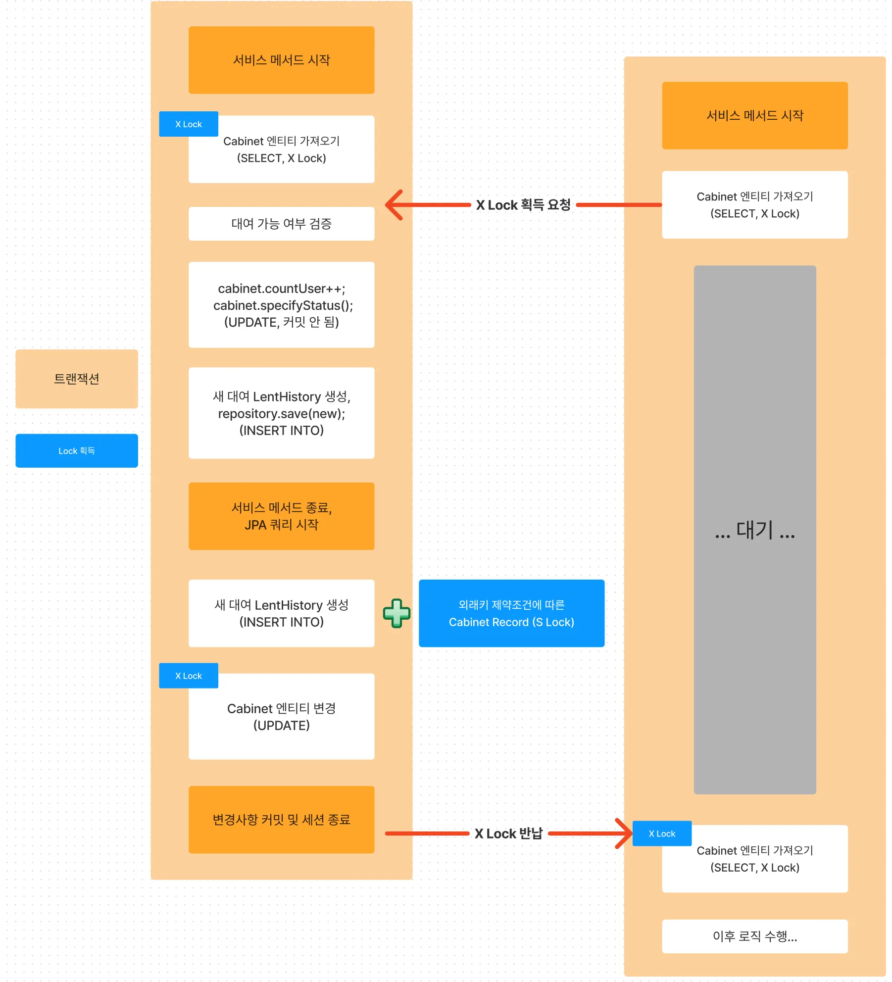 MySQL에서 사용하는 FOR UPDATE와 동일하게, 해당 읽어온 레코드에 대해서 X Lock을 부여한 상태로 대여 로직을 진행하게 되면, 트랜잭션 하나하나에서 해당 Cabinet에 대한 X Lock을 대기하고, 대기하는 순서대로 처리된다.