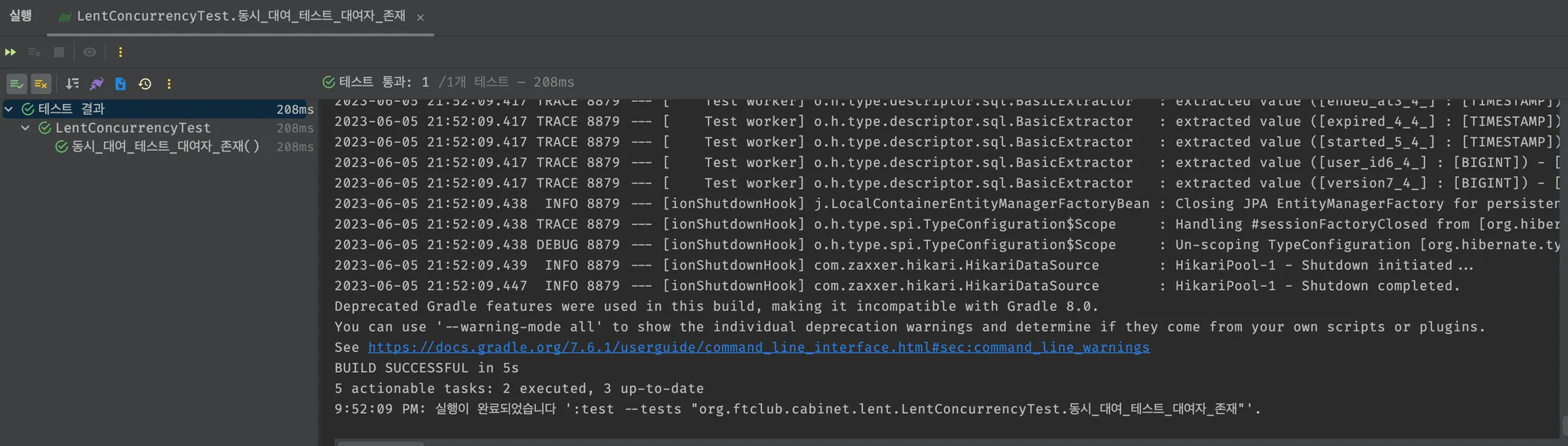 // 비관적 락을 통해, 동시적 대여가 X Lock을 획득하는 순으로 처리된다. (3/3)