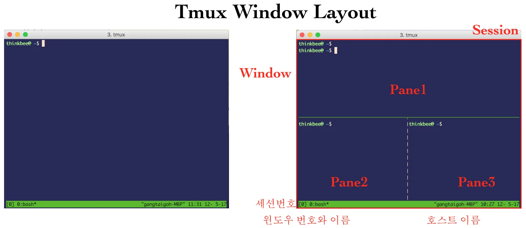 쉽게 말해서 panel, window, session을 관리하는 도구입니다. 패널은 화면상에 보이는 영역을 의미하비다. windows는 분할 시켜놓은 패널 설정 창입니다. 그래서 window를 옮겨가면 내가 임의로 설정해놓은 분할 패널을 사용할 수 있습니다. 마지막으로 세션은 winodow들이 모여있는 작업 공간이라고 생각하시면 됩니다.