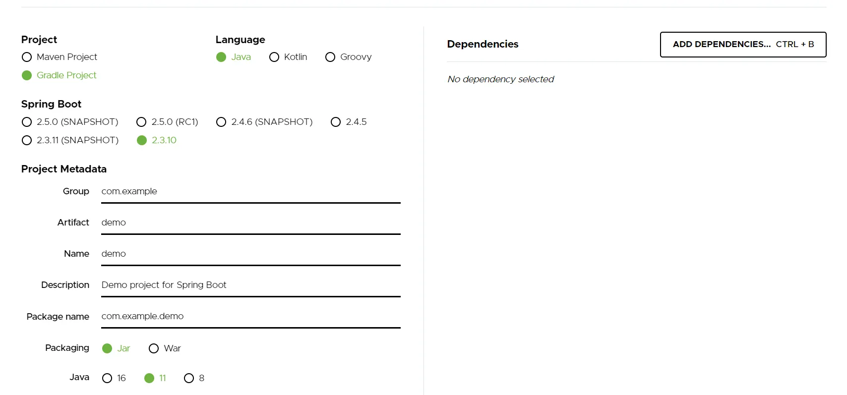 위 사이트는 단순히 spring 프로젝트를 만들기 위해 만들어졌다. 너무나 간단하고 모든 세팅을 해주고 시작한다. 심지어 .gitignore까지 만들어준다. 해당 홈페이지는 spring 공식 홈페이지에서 운영하고있다.