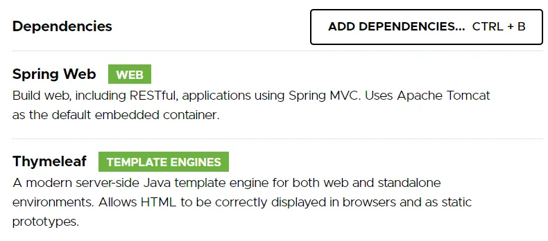 당연히 나는 스프링 web을 넣어주었고 그 다음은 html을 처리해주 템플릿 엔진으로 타임리프를 사용했다. 이러고