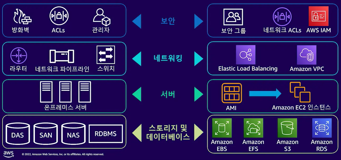 온프레미스 IT환경 → 비즈니스 시스템을 실행하는데 필요한 모든 물리적 구성 요소를 회사에서 소유, 운영, 유지 관리 및 보관