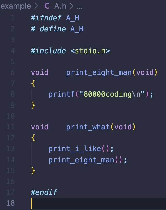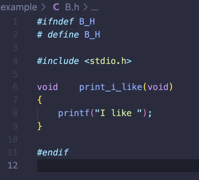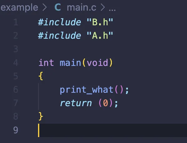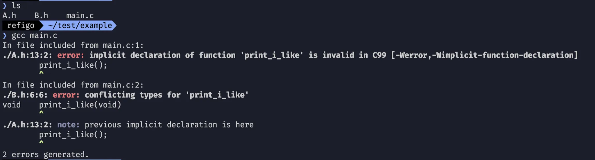 당연히 위의 A.h 안에 B.h을 포함하면 문제를 해결할 수 있다. 하지만 여기서 우리가 봐야할 부분은 헤더파일의 선언 순서이다. 초기 A.h 파일에 B.h를 선언하지 않아서 문제가 있는 상황인데도 불구하고 컴파일을 할 수 있었다. 지금은 컴파일이 잘 돼도 나중에는 안 되는 상황이 생길 수 있다. 이렇게 되면 초기에 문제를 인지하지 못하고 지뢰마냥 계속 가지고 가게된다.