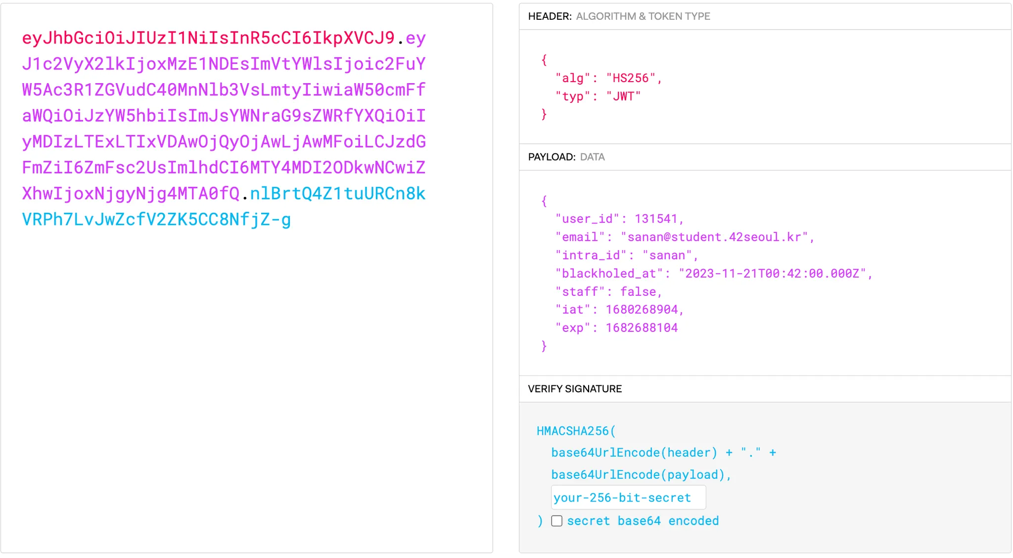 위 사진을 통해 Payload를 보시면, 제 인트라 고유 id, email, intra id, 블랙홀 기간 등에 대한 정보들을 담고 있는 것을 알 수 있습니다.
