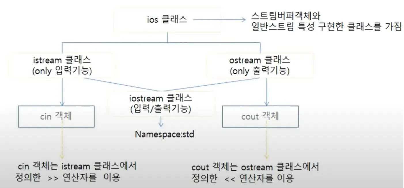 std 네임스페이스에 속한 cin, cout객체는 <iostream>클래스내에 있는 인스턴스이다.