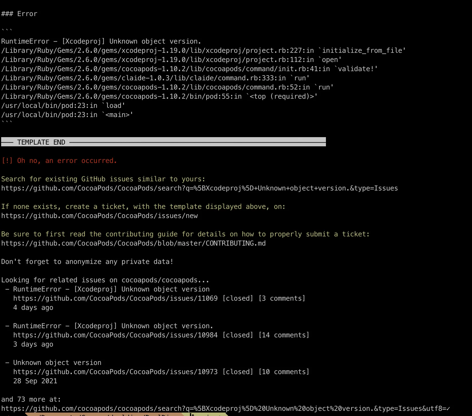 만약 아래와 같은 에러가 나온다면 당황하지 말고 cocoapods을 재설치하자