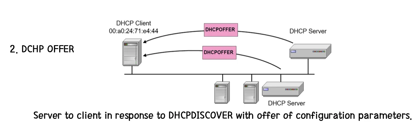 [2] Server는 Client의 메세지로부터 반응하여 DHCPOFFER를 보낸다. 이 때 DHCP Server가 제안한 IP 주소는 yiaddr 필드에 채워져서 보내진다. 이 때 제안한 주소 값은 별도의 테이블을 두는 것처럼 Offer한 주소를 Reserve 하지 않기 떄문에 DHCPDISCOVER를 받아서 DHCPOFFER를 했을 때, 여러 Machine에게 동일한 주소를 Offer 할 수도 있다. 따라서 Offer 받은 것에 대해서 먼저 Requset를 보낸 Client가 주소를 갖게 된다. (Reserve가 되지 않기 때문에 Server는 Client로부터 Request를 받아 주소를 할당할 때 사용 중인 주소인지 반드시 확인을 하게 된다.)