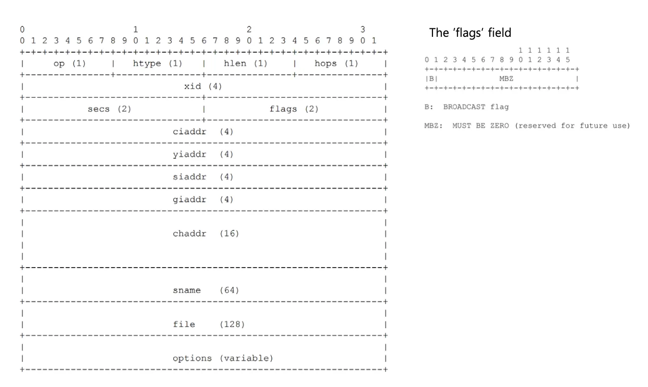 또한 Protocol을 이용하는 소프트웨어가 IP 주소 구성이 되지 않아서 Unicast로 Datagram을 수신할 수 없는 상태라면, DHCPDISCOVER와 DHCPREQUEST에서는 flag 필드의 Broadcast 비트를 1로 설정해놓아야 한다.