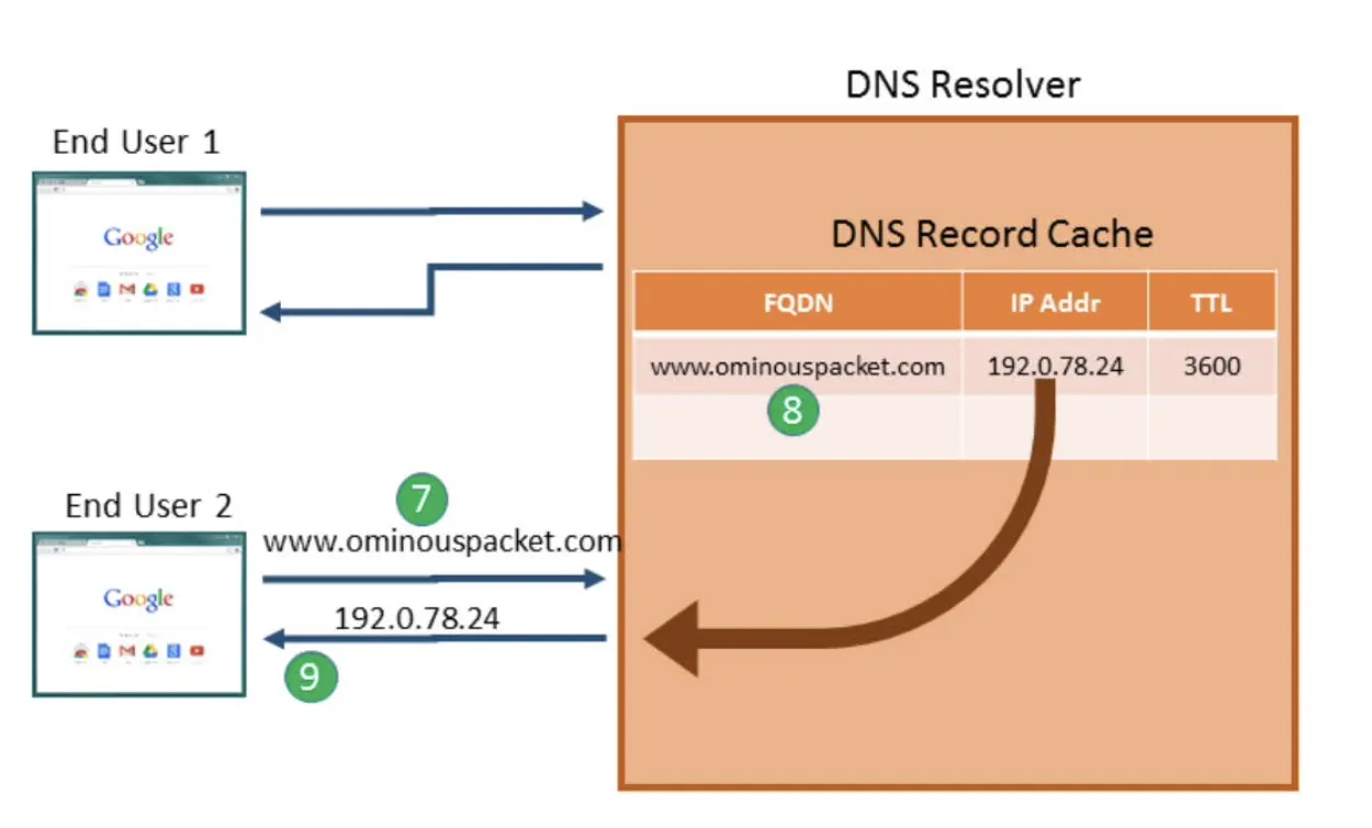 [7] 6까지 과정을 거친 후에 새로운 End User 2 시스템은 이전에 End User 1 시스템이 방문했던 Domain Name에 방문하려고 하는 상황이라고 하자. End User 2 시스템 역시 DNS Resolver로부터 해당 Domain Name의 FQDN을 얻기 위한 Recursive Query를 만들어 보내게 된다.