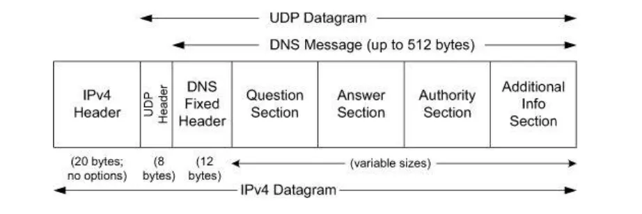 DNS Protocol을 사용하면서 나타나는 위와 같은 형식의 메세지는 Packet에 아래 그림과 같이붙는다.
