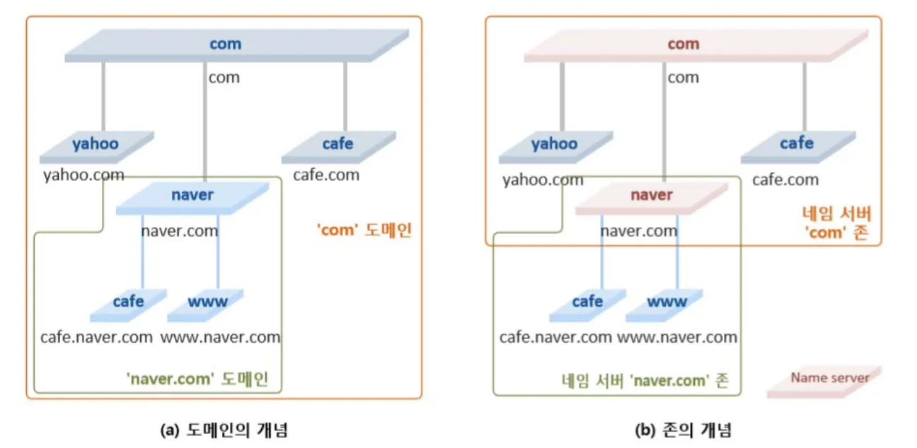 Domain은 한 Node에서 관리하는 영역을 말하고 (즉, 해당 Node의 하위 영역을 포함한 영역 혹은 한 개체에 의해 관리되는 부분 영역을 말함), Zone은 하나의 Name Server가 관리하는 영역을 말한다.