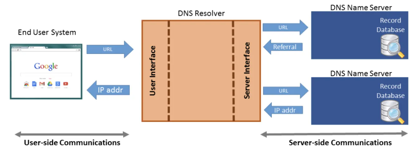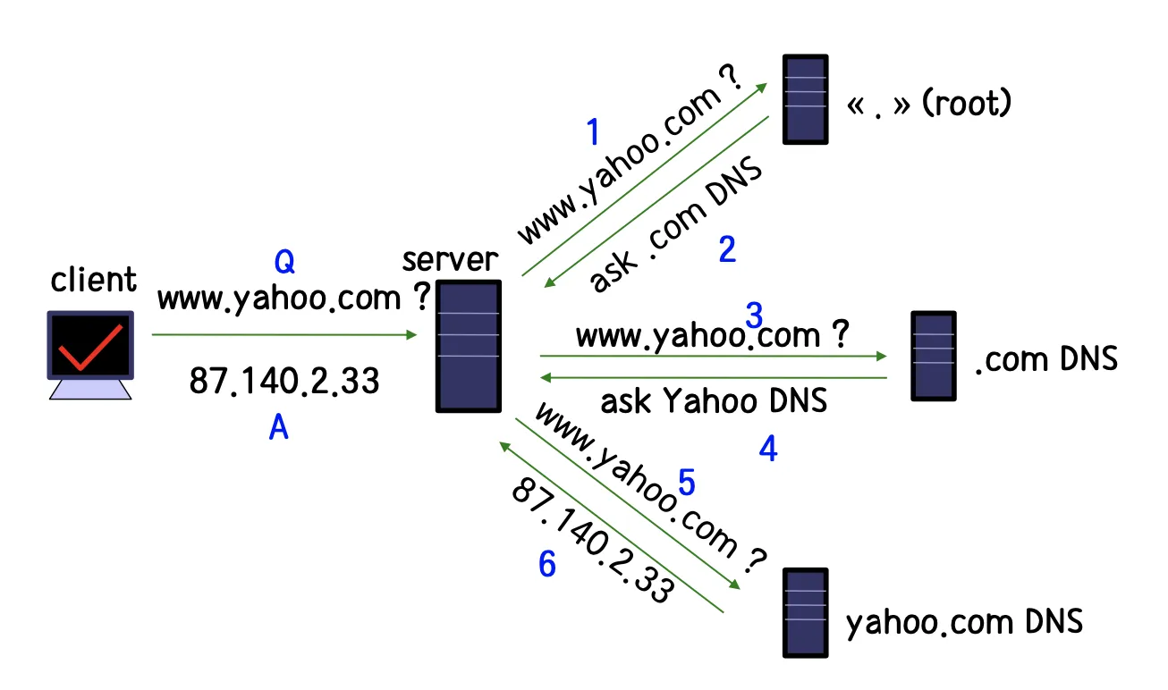 Client는 DNS Resolver라는 메커니즘을 이용하여 Server에게 Domain Name에 해당하는 IP 주소를 물어본다. (이를 Query라고 한다.) Query를 받은 Server는 이에 대한 답을 찾는 시도를 한다. 이 때 Server는 Recursive하게, Root부터 Top to Bottom으로 답을 찾으려고 한다. 혹여나 자신의 Machine 내에서 답을 찾지 못한다면 다른 Server에게 답을 물어보게 된다. (즉, Server는 다른 Server에 의해 참조될 수 있다는 것이다.)