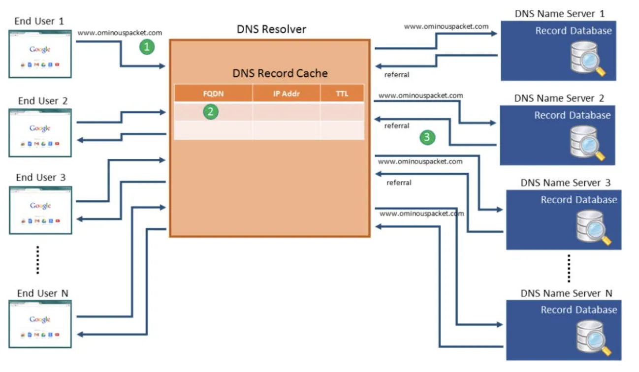 [1] End User 1 시스템이 DNS Resolver에서 Domain Name에 해당하는 IP 주소를 찾을 수 있도록 Recursive한 DNS Query를 만든다.