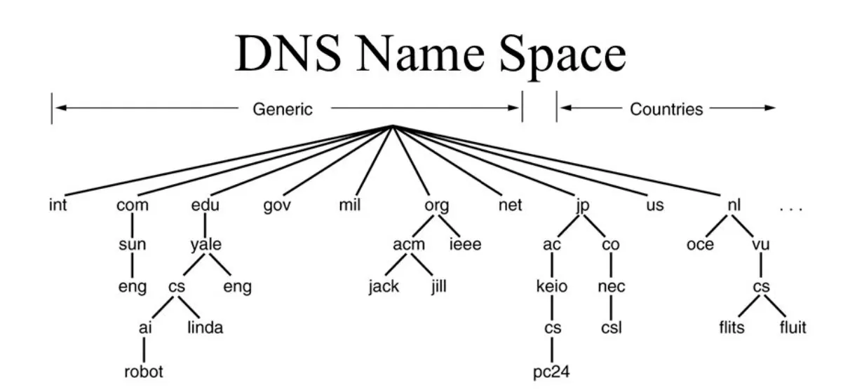 인터넷은 200개가 넘는 최상위 Domain들로 나뉘어져 있다. 여기서 나뉘어진 Domain들은 다시 Sub-Domain으로 나뉘어지기 때문에 모든 Domain들은 위 그림과 같이 Tree 형태로 나타낼 수 있다. 위에서 나타난 것처럼 최상위 Domain들은 Generic하거나 Country를 표현할 수 있어야 한다.