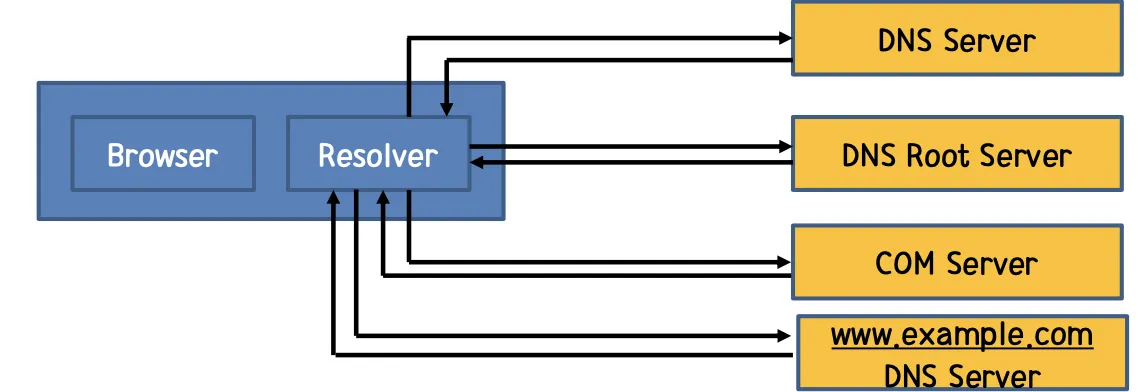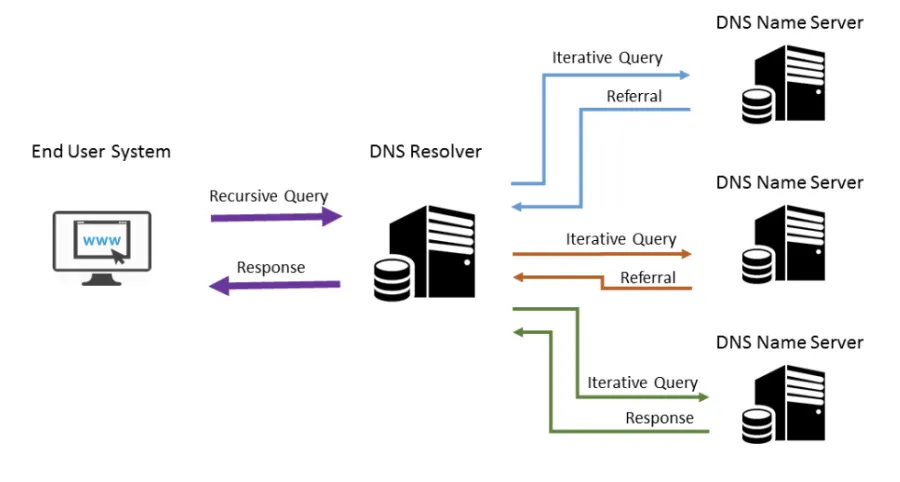 만일 DNS Name Server가 답을 갖고 있지 않다면, 바로 다음 Name Server에 묻는 것이 아니라 어느 Name Server로 물어보면 좋겠다는 추천에 대한 응답을 보내주게 된다. 반대로 만일 Name Server가 Query에 대한 답을 갖고 있다면, 해당 답을 응답하게 된다. 위 그림의 Iterative Query 부분에서 (다른 Name Server로 부터 받은 추천을 통해) 답을 찾아내는 과정은 전적으로 OS의 Resolver에 달려있다.