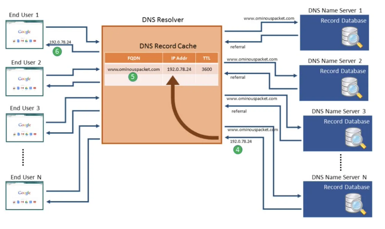 [5] DNS Name Server로부터 DNS Record를 받게되면, 이 정보를 DNS Resolver에 Caching을 수행한다. 이 때 Caching된 Entry들에 대해서는 TTL(Time To Live)이라고 하는 만료 시간에 대한 값도 같이 기록된다. 만일 TTL이 만료되면, Cache에 대한 Entry는 DNS Record Cache에서 사라지게 된다. (일반적으로 TTL은 3600초부터 시작하는 Count Down Timer라고 생각하면 된다.)