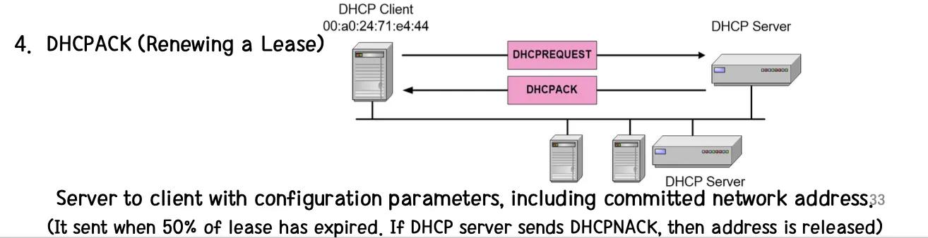 [4] Server는 Lease Time까지 해당 주소를 이용할 수 있도록 주소에 대한 Client의 Binding을 수행한다. (Binding을 해줘야 할당 된다.) Binding이 끝났다면 DHCPACK을 보내게 된다. 만일 할당에 실패하면 Client에게 DHCPNAK을 보낸다. (Client 측에서 Server에서 보낸 DHCPACK을 받았다면, 해당 Packet 내에 있는 Lease Time도 확인하면서 다른 다양한 Parameter에 대한 최종 확인을 한 후 이용한다.)