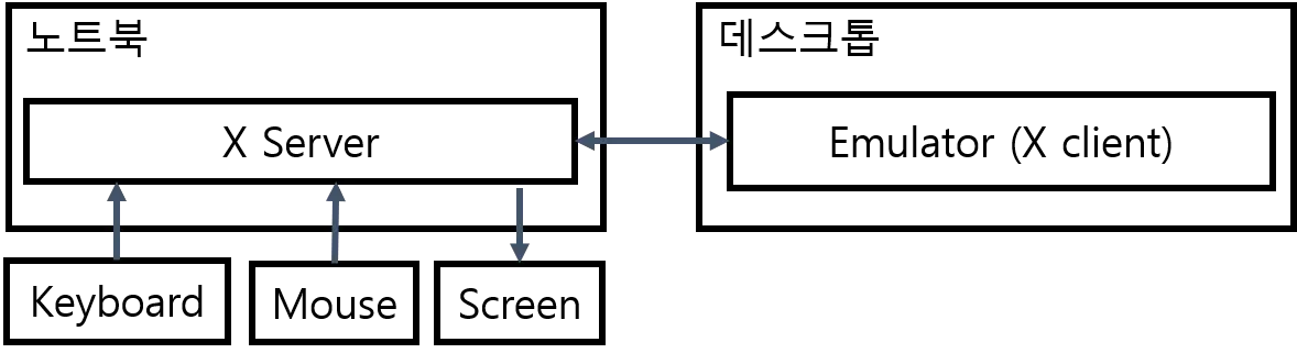 에뮬레이터는 데스크톱에서 돌아가지만, 화면만 노트북으로 공유되는 형식이다.