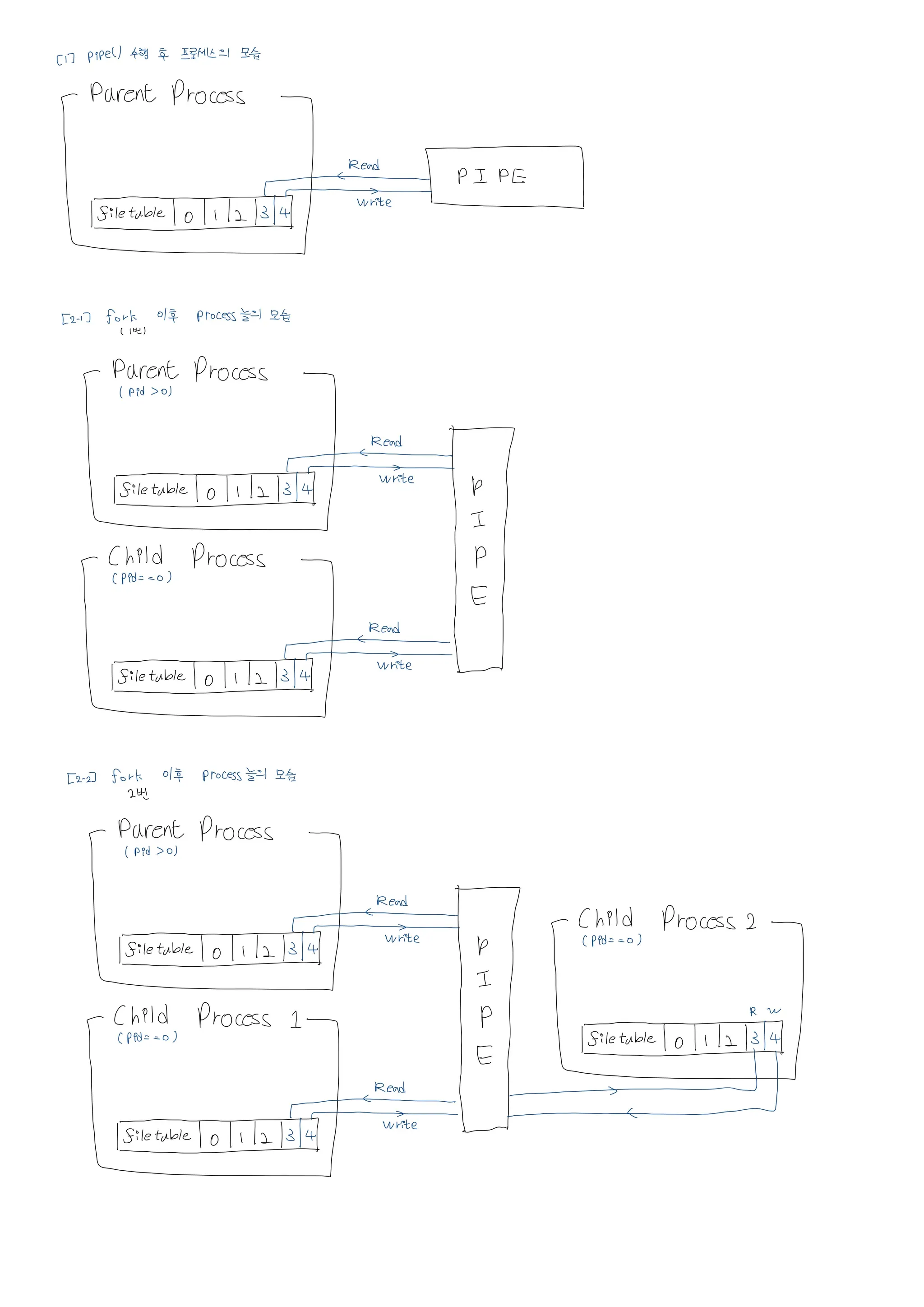 따라서, 파이프를 개설하고, 프로세스를 두 번 fork() 한다면, 동일한 파이프를 부모, 자식1, 자식2가 모두 하나의 파이프를 바라볼 수 있게 된다.