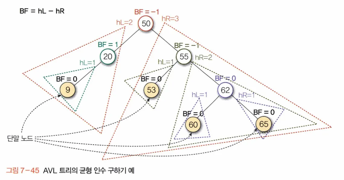 아델슨 벨스키와 란디스가 제안한 대표적인 균형 이진 탐색트리인 AVL은 왼쪽 서브트리의 높이 hL과 오른쪽 서브트리의 높이 hR의 차이를 1 이하로 합니다.