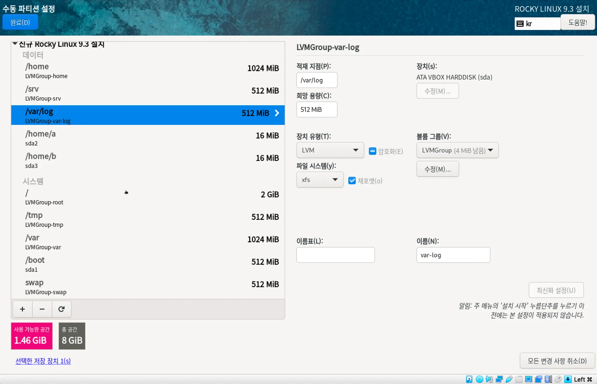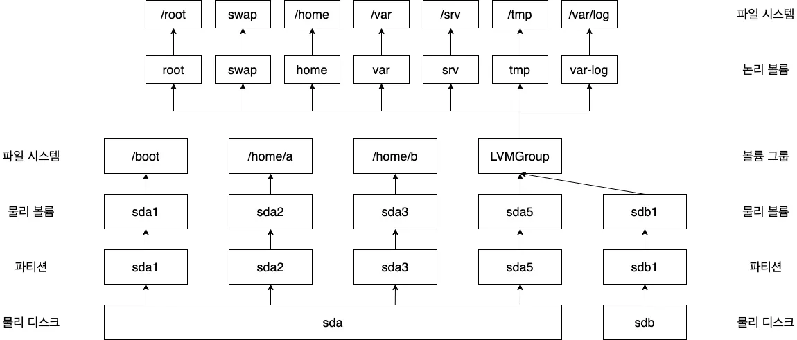 /boot, /home/a, /home/b는 표준파티션으로 생성하였기 때문에 파티션과 바로 연결되는 반면, 나머지 영역은 볼륨 그룹인 LVMGroup에서 각각 논리 볼륨으로 다시 나뉘어져 할당된다.