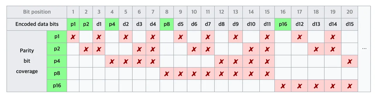 n 번째 패리티 비트는 n 비트에서 시작하여, n 비트 만큼을 포함하고, n 비트 씩 건너뛴 비트 들을 대상으로, 패리티 비트를 결정한다.