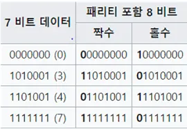 짝수 패리티 : 프레임에 포함된 1의 개수가 짝수가 되도록 비트 구성