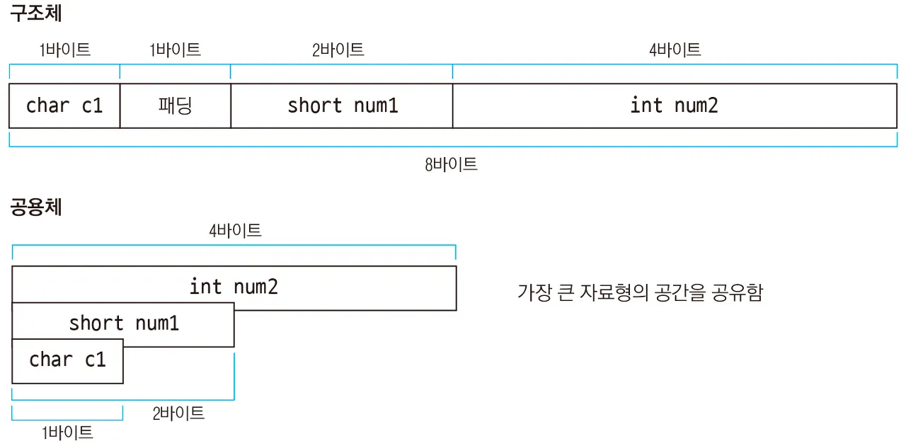 구조체와 동일하지만 공용체의 경우는 가장 큰 자료형의 공간을 공유한다.