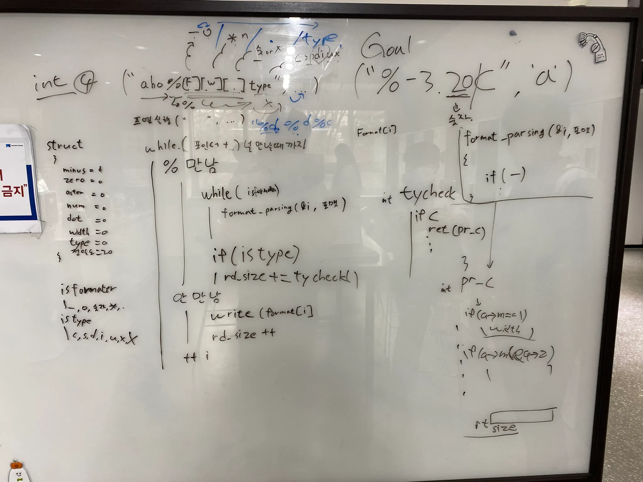 이번 프로젝트를 진행하기 전 다짐한 내용이 있었다. 이번 프로젝트 과제부터는 절대로 코드먼저 잡지 않고 구조 설계와 psudo code를 먼저 구상한 다음 코드작성 작업을 하기로 다짐했다. 하지만 ft_print과제 특성상 혼자서 모든 예외처리를 다 잡는 구조를 만들어 내기엔 아직 역량이 부족해서 훌륭한 두 친구 찬호, 현준과 함께 구조설계를 진행하였다.