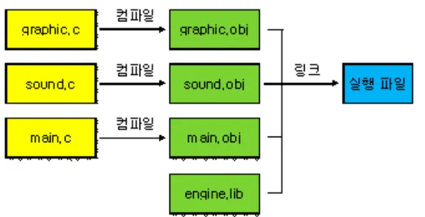 소스 파일(.c)을 컴파일한 오브젝트 파일(.obj)과 라이브러리 파일(.lib)을 링크시켜 최종적으로 실행 파일을 만든다.