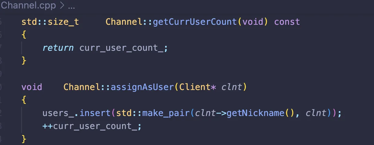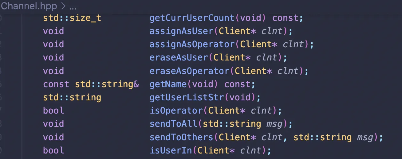 irc 서버를 C++로 구현하면서 부족한 점을 많이 느꼈다. C++를 사용하는 이유 중 하나가 객체지향 설계를 좀 더 용이하게 할 수 있는 것인데 프로그램을 만들면서 제대로 객체지향 개념을 이용하지 않았다.