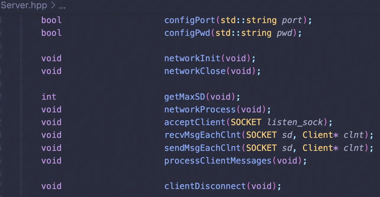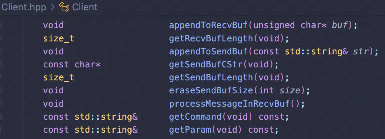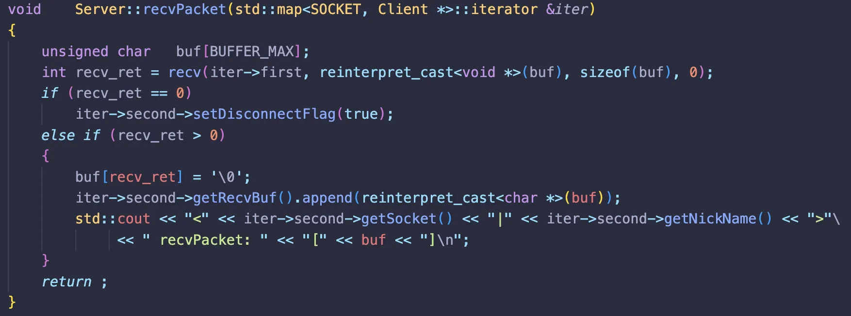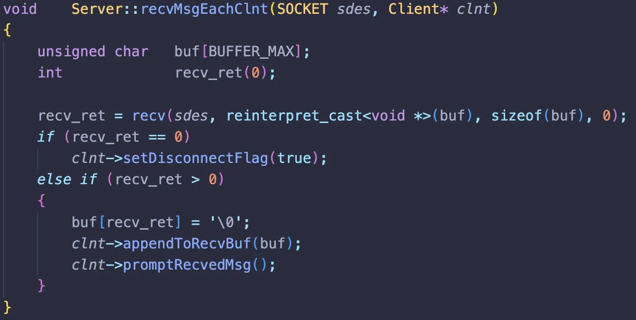 예를들어 위 사진과 같이 된 이유는 처음에 Client class를 만들면서 데이터부터 결정했기 때문이다. 클라이언트 객체라면 실제 클라이언트에게 받은 메시지를 가지고 있어야 한다는 생각으로 먼저 결정했다. 그러고 Server 객체가 네트워크 소켓으로 클라이언트의 메시지를 받을 때 클라이언트의 recv_buf를 사용하자는 생각으로 직접 데이터를 조작했다.