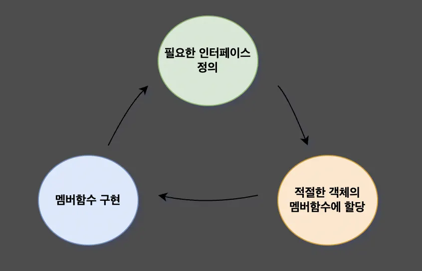 필요한 인터페이스 정의, 적절한 객체에게 할당, 멤버함수 구현의 순한, 반복 프로세스