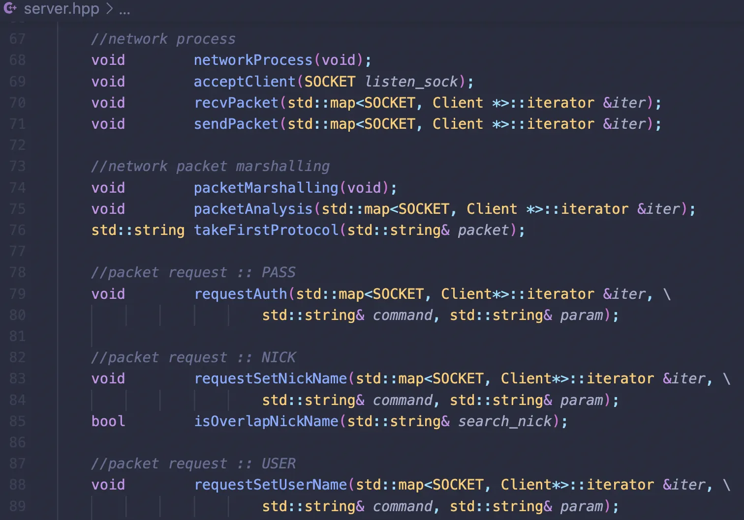 Server class 안에서 네트워크, 메시지와 irc 프로토콜 명령어까지 모두 처리한다. …나중에 호되게 당했다.