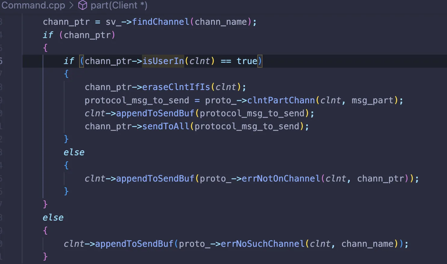 예를 들어 Command 객체가 PART 명령어 로직을 처리한다고 보자. PART 명령어는 클라이언트가 특정 채널을 나간다고 요청하는 명령어다. 이 부분을 구현하면서 그 채널 안에 명령어를 요청한 클라이언트가 등록이 되어있는지 확인하는 부분이 필요하다. 기존에 그런 요청을 받는 객체가 없다면 필요한 인터페이스를 정의하고 가장 적합한 객체를 선택해서 그 객체의 인터페이스로 등록한다. 여기서는 isUserIn() 이라는 인터페이스를 정의하고 Channel class에 멤버함수로 등록해서 사용했다.
