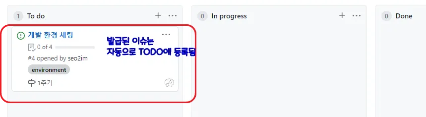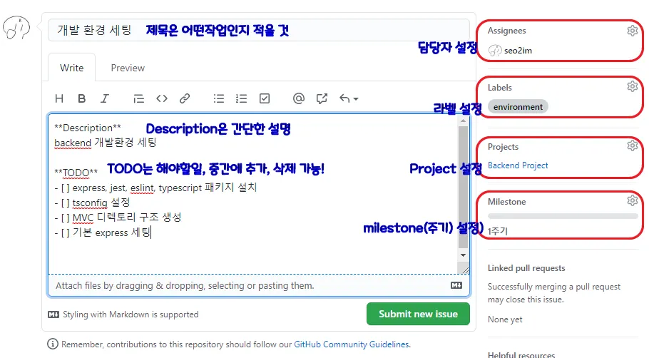 이슈 발급에서 label(라벨), project, milestone(주기), assign(담당자)를 설정한다.