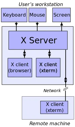 X클라이언트 (프로그램)가 X서버에 띄울 화면을 알려주고, X서버는 X클라이언트한테 마우스와 키보드 같은 입력을 전달해준다.