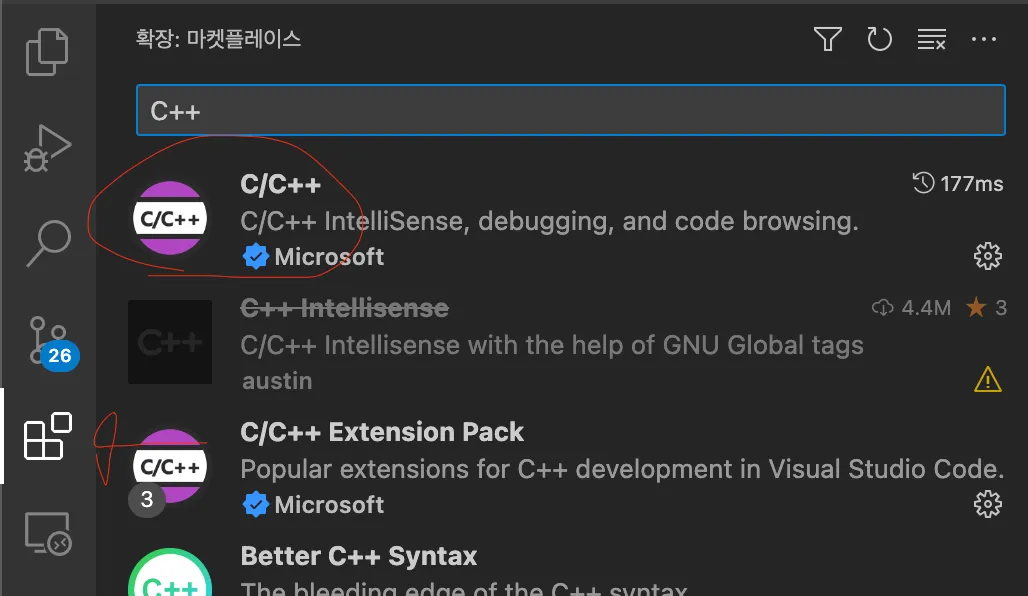 VSC 좌측탭에서 extension 아이콘을 클릭하고(빨간화살표)