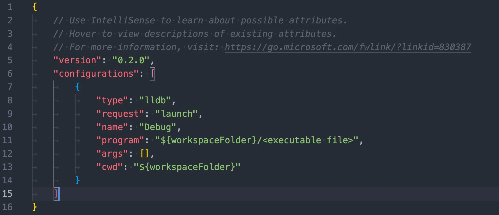 이제 여기서 program에 내가 실행시킬 파일 위치를 적어주면 돼요. 예를 들어 현재 작업중인 폴더에 있는 a.out을 실행시키고 싶으시면 “${workspaceFolder}/a.out”으로 바꿔주시고 만약 인자로 1, 2, 3을 주고 싶으시면 args에 [”1”, “2”, “3”]으로 넣어주시면 됩니다!