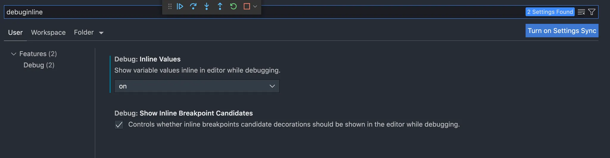 추가로 vscode설정(cmd + ,)에서 debuginline을 검색해서 inline values를 on으로 바꿔주면 변수가 가리키는 값을 코드 안에서 볼 수 있어서 더 편해요!