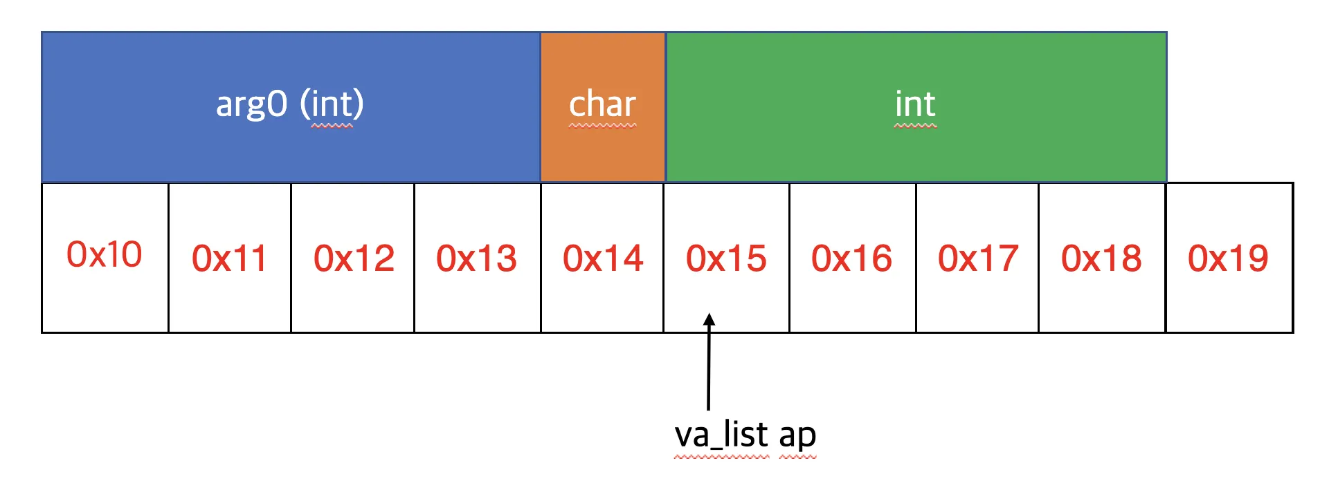 ap는 다음 va_arg 호출에서 sizeof(int)만큼을 이동하여 0x19를 가리키게 될 것이다.