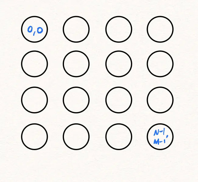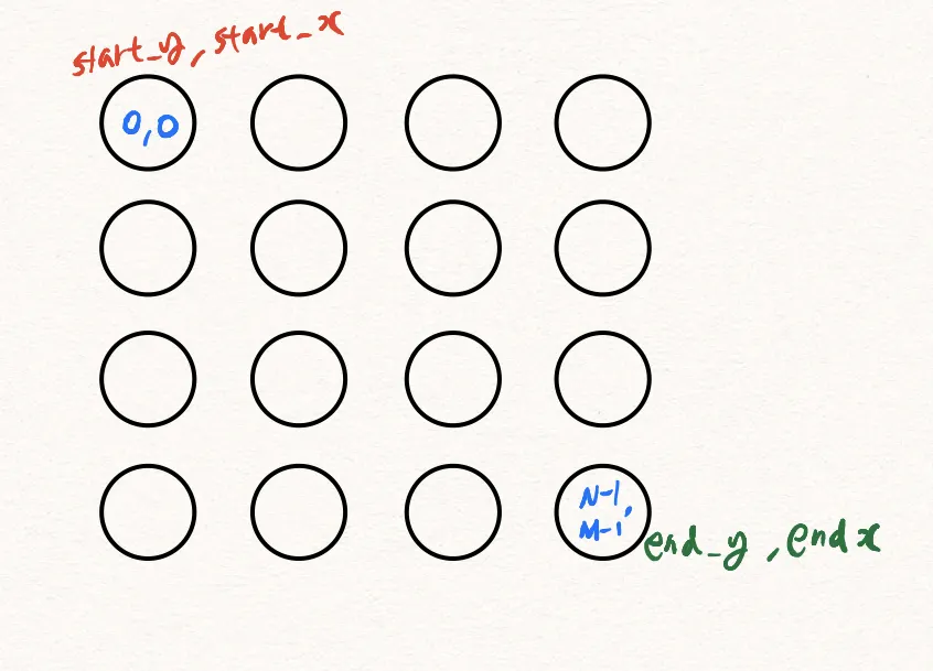 시작 위치는 0,0 이고, 가장 마지막은 N - 1, M - 1입니다.